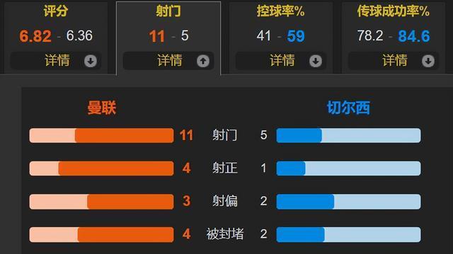 全场比赛,曼联的控球率为41%,一共有11次射门,其中4次射正;切尔西一共有5次射门,其中1次射正。