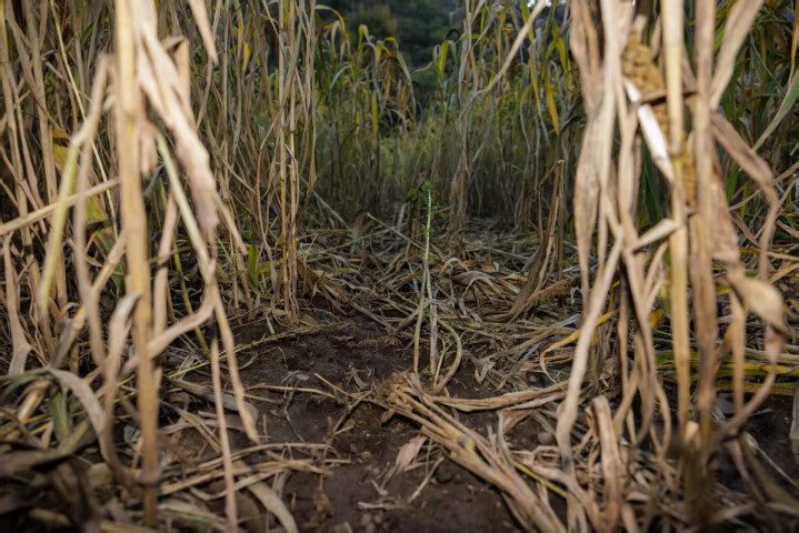 野猪在谷子地里经过时留下的“专用道”。新京报记者王子诚摄