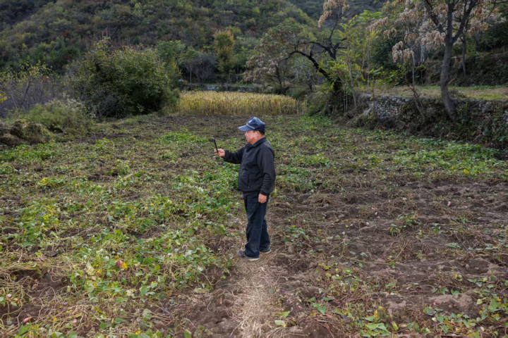王进军在野猪拱过的红薯田中拍照。新京报记者王子诚摄