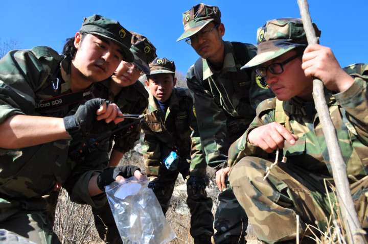 房山十渡地区,野保人员在查看野猪粪便。受访者供图